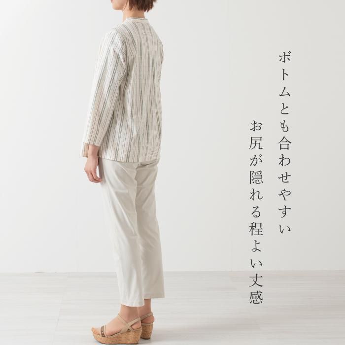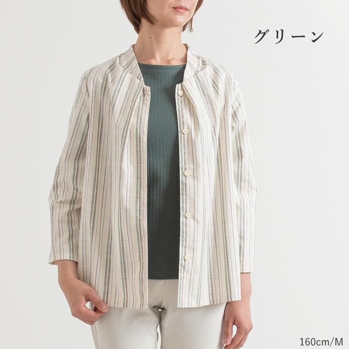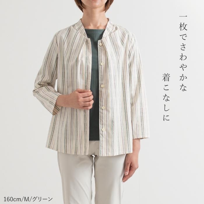 ドビー織の織柄と先染めの縞柄を合わせ、和の風合いを残しつつナチュラルなテイストに仕上げました。 タック入りのスタンド衿はコーディネートのアクセントにも。 1枚でおしゃれが完成するおすすめの1枚です。