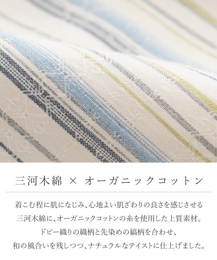 着こむほどに肌になじみ、心地よい肌触りを感じさせる三河木綿に、オーガニックコットンの糸を使用した上質素材。
