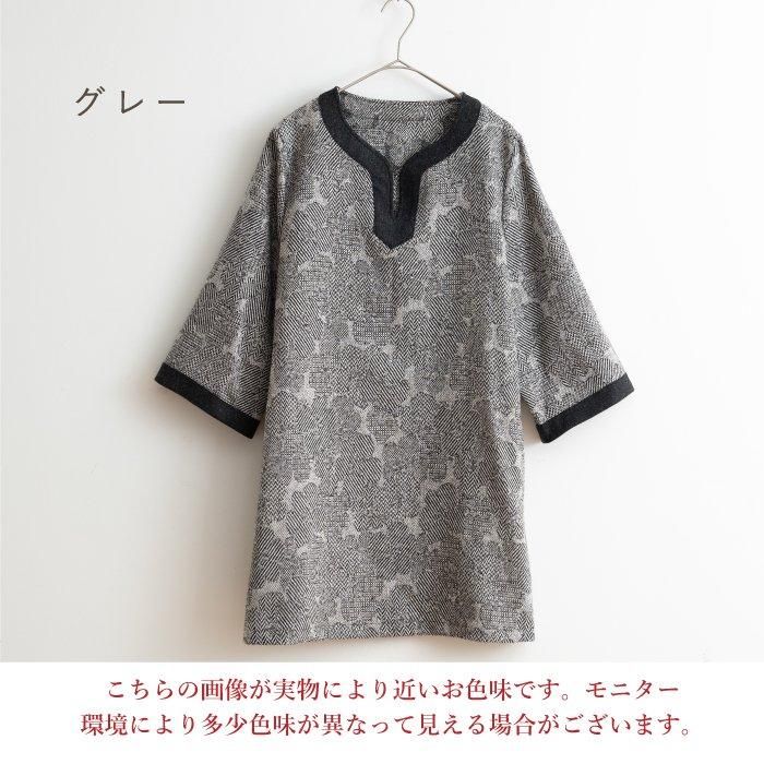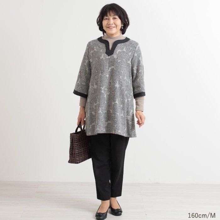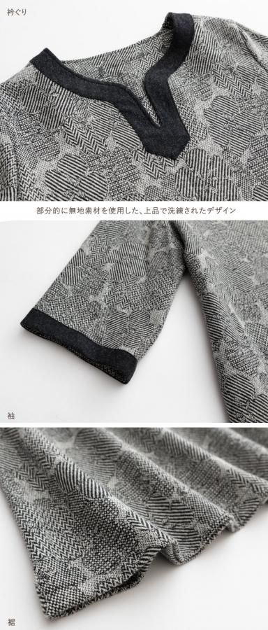 ウール混で温かみもありつつ、織りが成す模様で上品な風合いを感じられます。 首元はキーネックですっきり見せつつ、長めの丈と余裕のある身幅でゆったり楽にお召し頂けます。