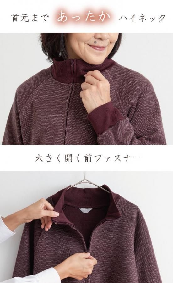 細かな柄のように織模様がみえるティミアンは、ソフトで軽く保湿性に優れた素材。 内側は裏起毛でさらに暖かくやさしく身を包んでくれます。 衿と袖口はリブ仕様になっており、風を通さずしっかりと寒さから守り、また袖は捲りやすく作業時にもストレスなくお使い頂けます。
