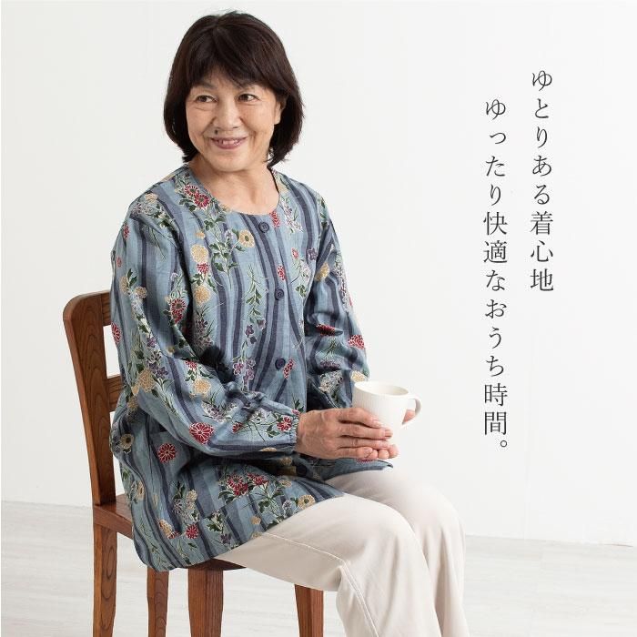 国産の和柄木綿を使用した前開きタイプの着心地ゆったりスモック。