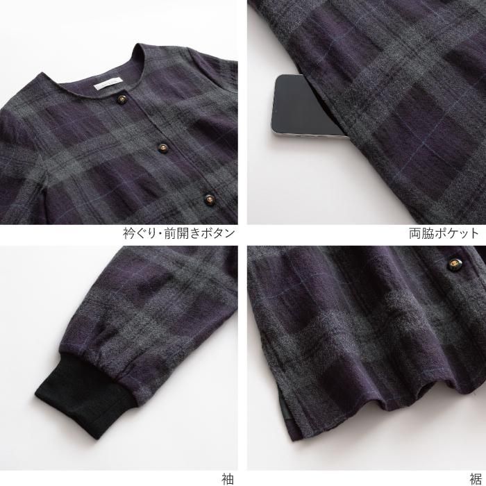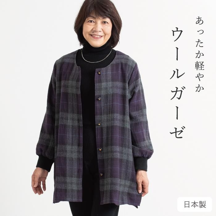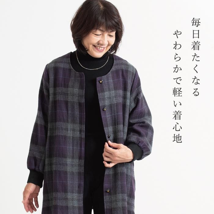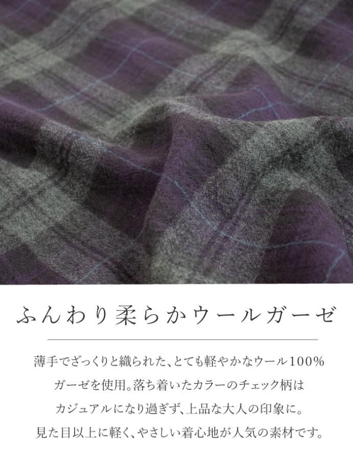暖かくやさしい着心地が人気のウールガーゼ100%を使用したセミコート。落ち着いたカラーのチェック柄はカジュアルになり過ぎず、上品な大人のおしゃれを引き立てます。