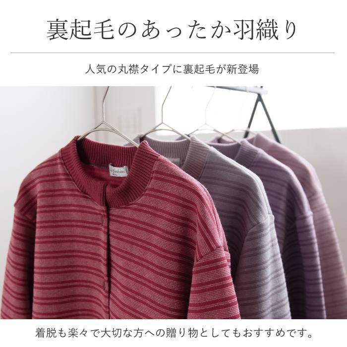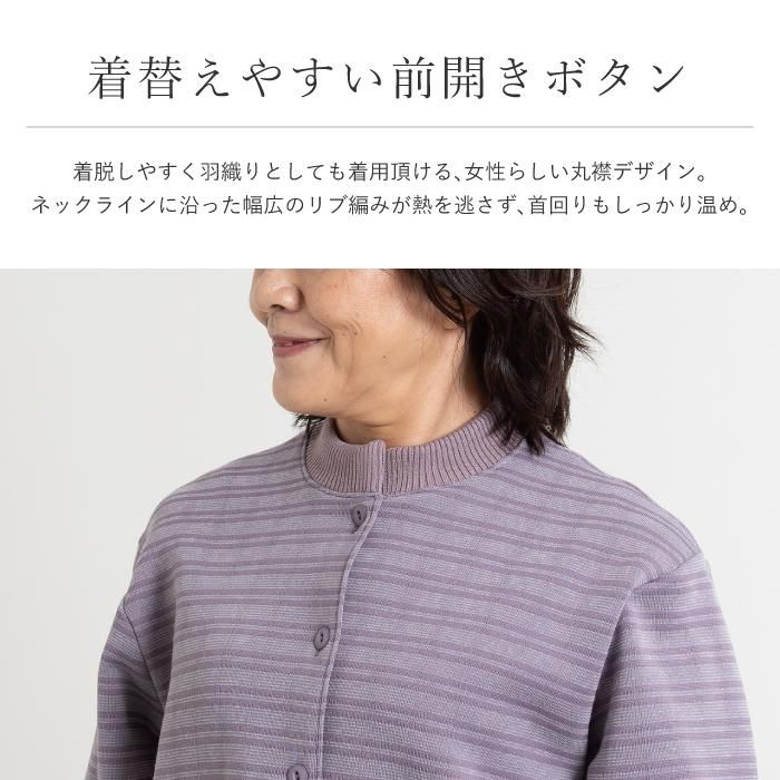 程よく肉厚な生地とふわふわ裏起毛が1つになったカーディガン。落ち着いた色合いのボーダー柄でしわになりにくくお手入れ楽々。