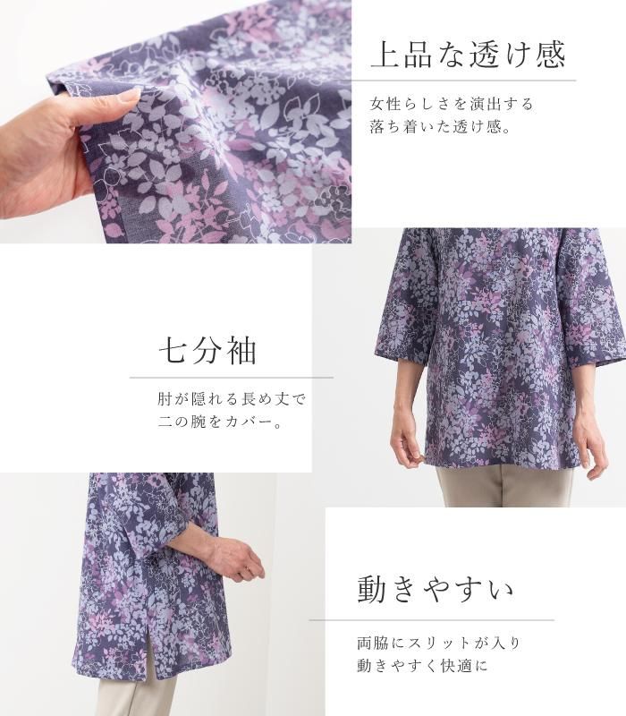 楊柳の生地感を損なわず、柔らかく味のある風合いに仕上げた1枚。全体に施されたリーフ柄が華やかさを演出し、薄手で軽やか。