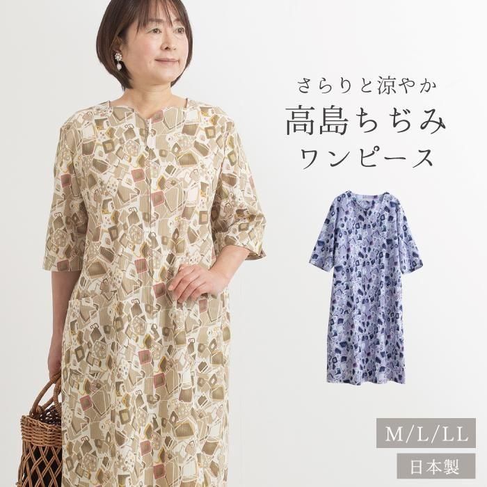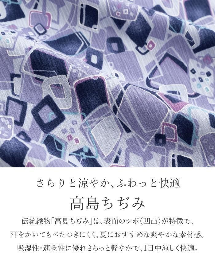 伝統織物「高島ちぢみ」は、表面のシボ(凹凸)が特徴で、汗をかいてもべたつきにくく、夏におすすめな爽やかな素材感。吸湿性・速乾性に優れさらっと軽やかで、1日中涼しく快適。リラックス感ある大人な印象に仕上げました。