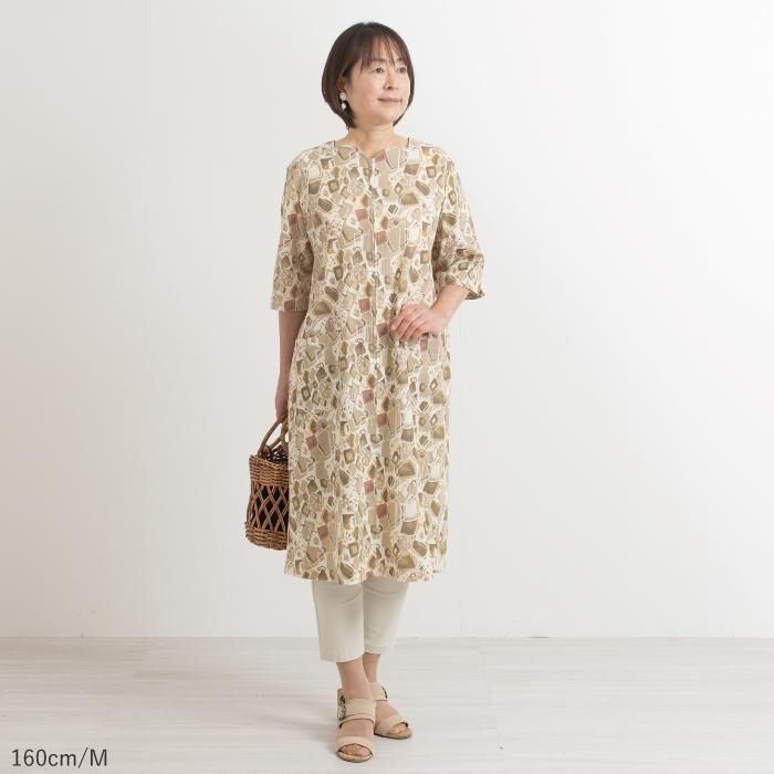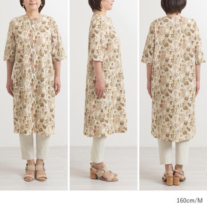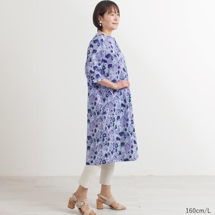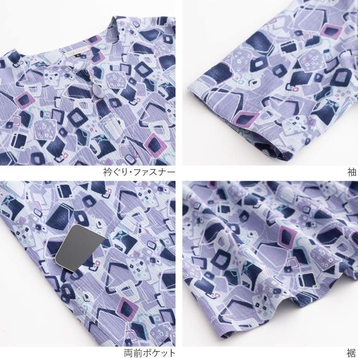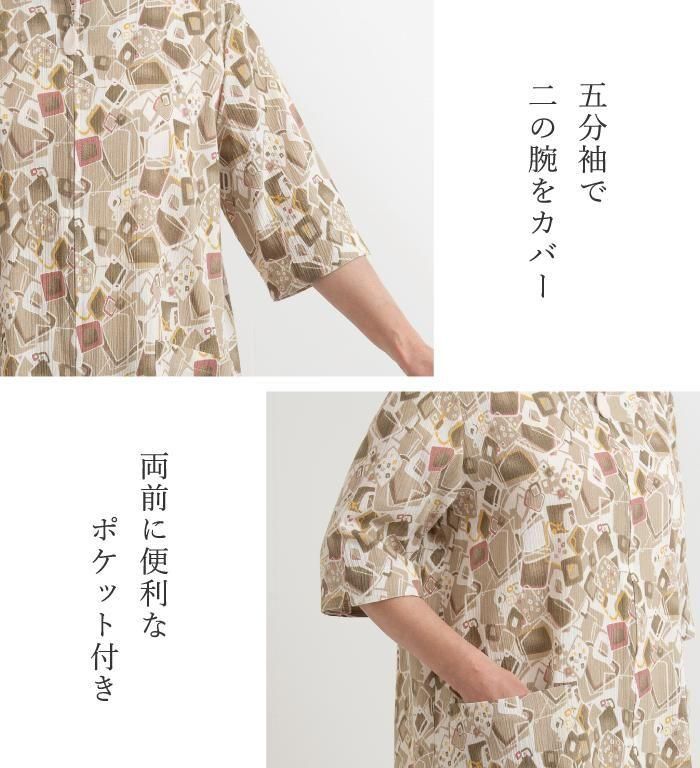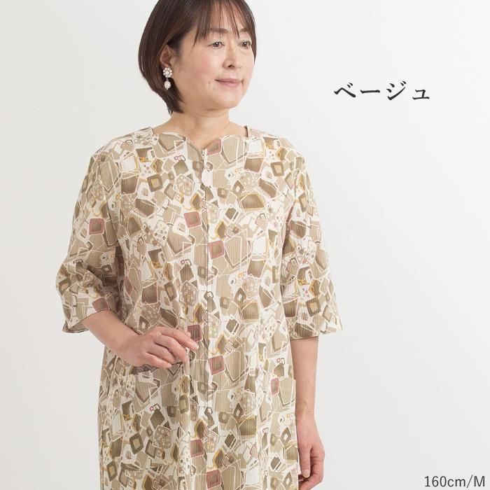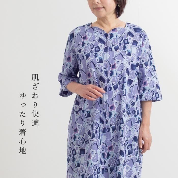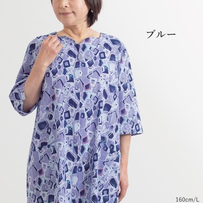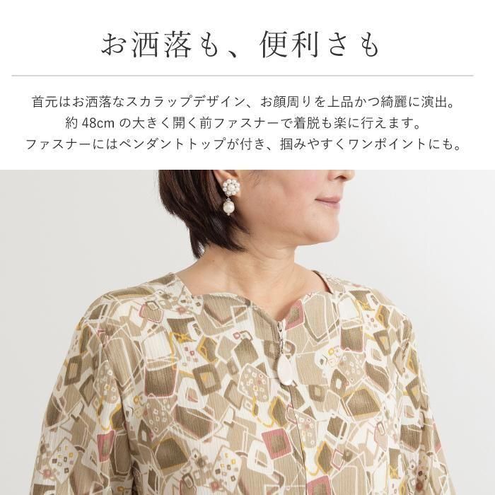 ゆったりとした着心地でリラックス感を持ちつつ、緩やかに広がるAラインで美しいシルエットに。胸元のスカラップデザインがおしゃれな1枚。家の中はもちろん、ちょっとした外出にも最適です。大きく開く前ファスナーで着脱も楽に行え、日常生活にやさしく寄り添う1枚です。