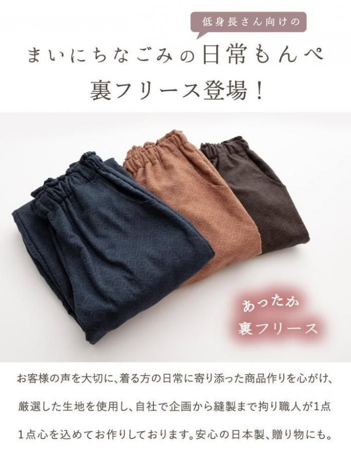 好評を頂いているお客様の声から生まれたお客様の声から生まれた、低身長さん向けのスッキリ楽もんぺにあったか裏フリースが登場。もっと股下の短いもんぺが欲しい、ゆったり感は欲しいけど股下はスッキリしたい、派手すぎない柄物を増やして欲しい….。低身長の方、細身体型の方にも日常に寄り添った、ゆったりの穿き心地なのにスッキリとしたシルエットのもんぺができました。通年お召し頂ける裏なしタイプもござます。