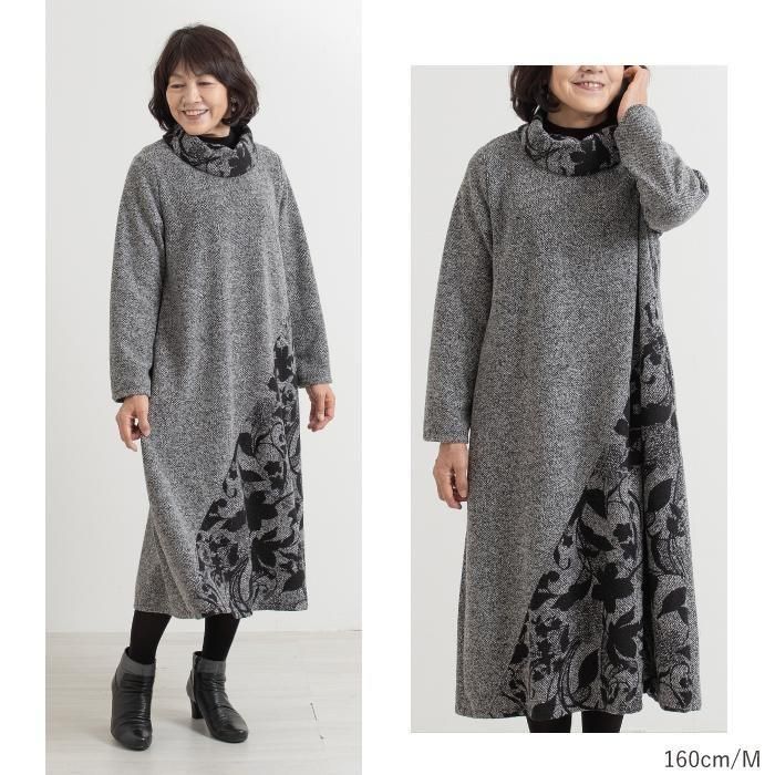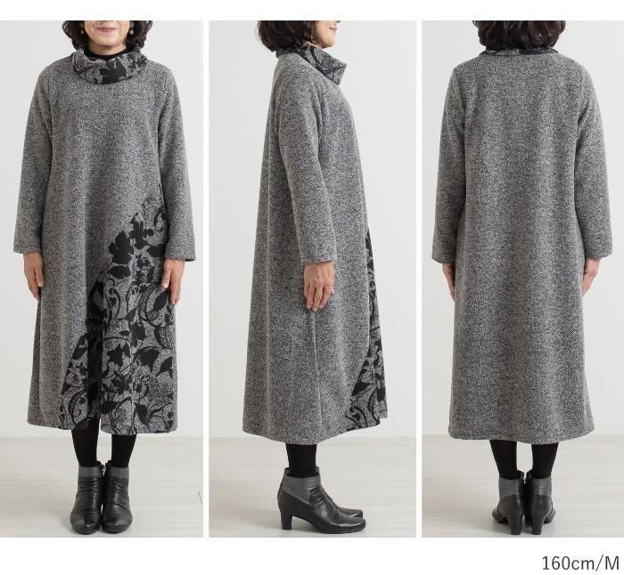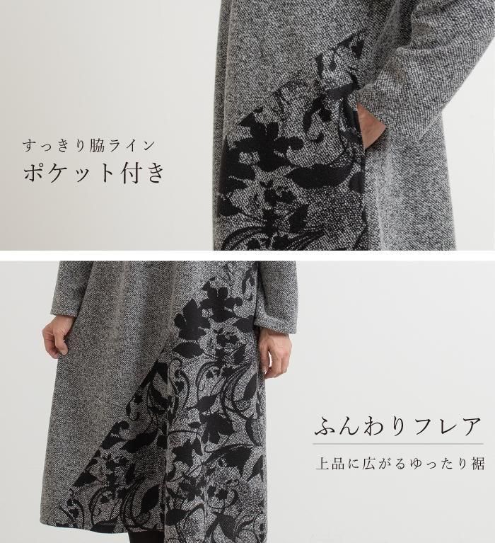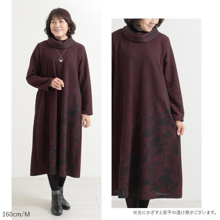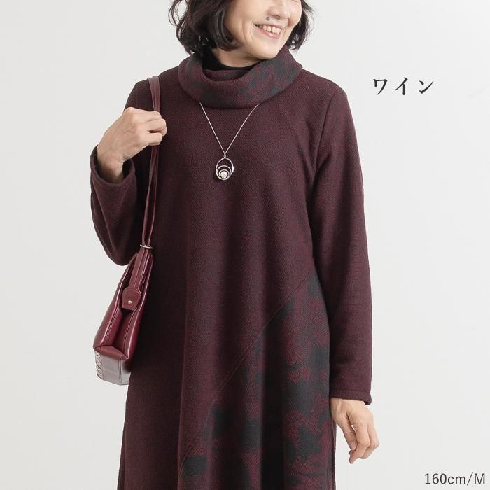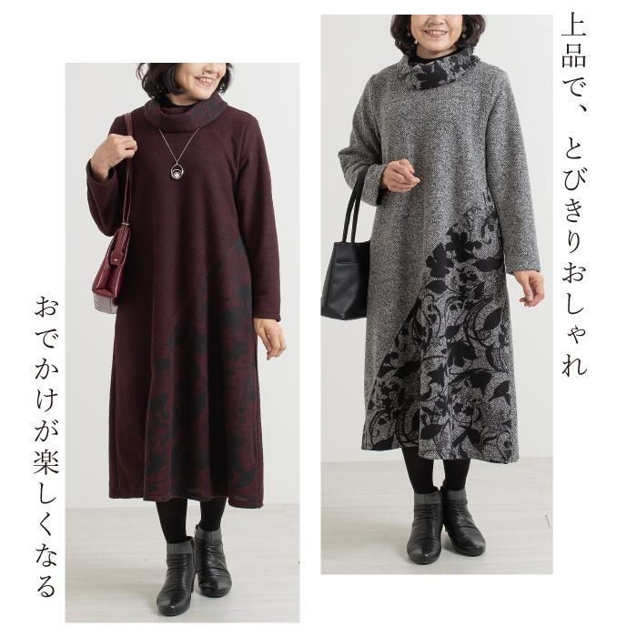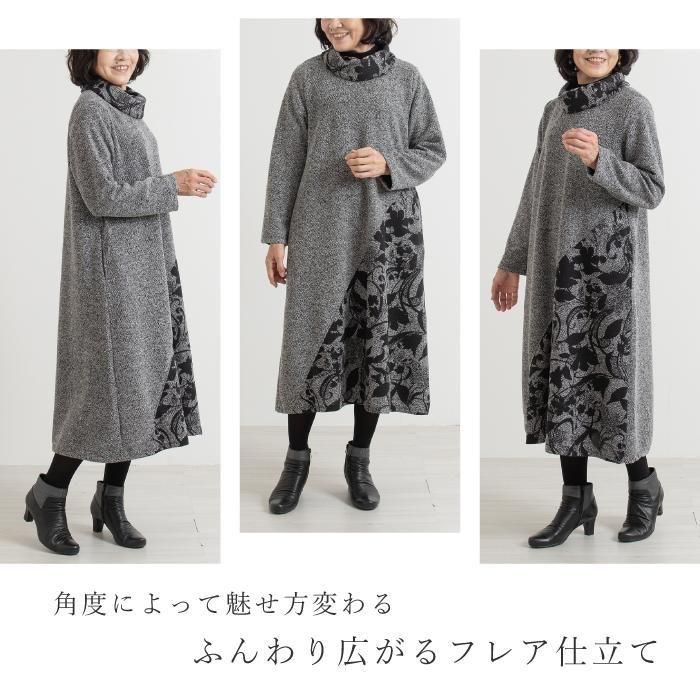 人気の「ブークレー調ニット素材」から、待望のワンピースが新登場。 お客様から寄せられた声をもとに、細部までこだわり抜いた一着です。 ふんわりと広がるフレアシルエットに、部分的な花柄の切り替えデザインがアクセント。無地ワンピースにはない華やかさを演出します。 オフタートルの衿元は、顔まわりをすっきり見せてくれるだけでなく、着脱もスムーズ。 たっぷりと生地を使った贅沢なロング丈は、お出かけをより楽しく、おしゃれにしてくれます。
