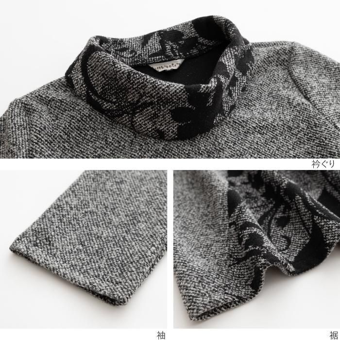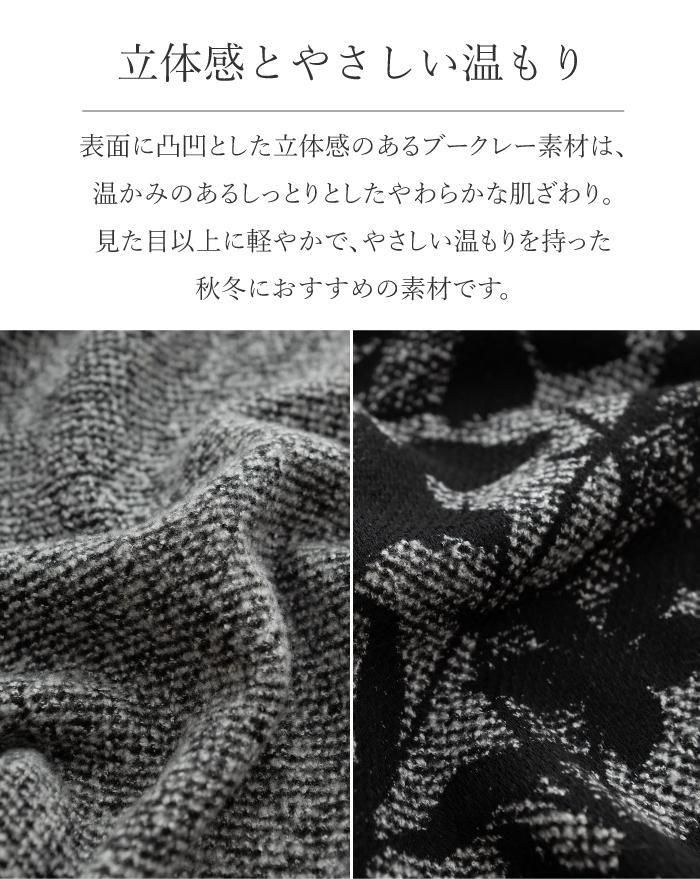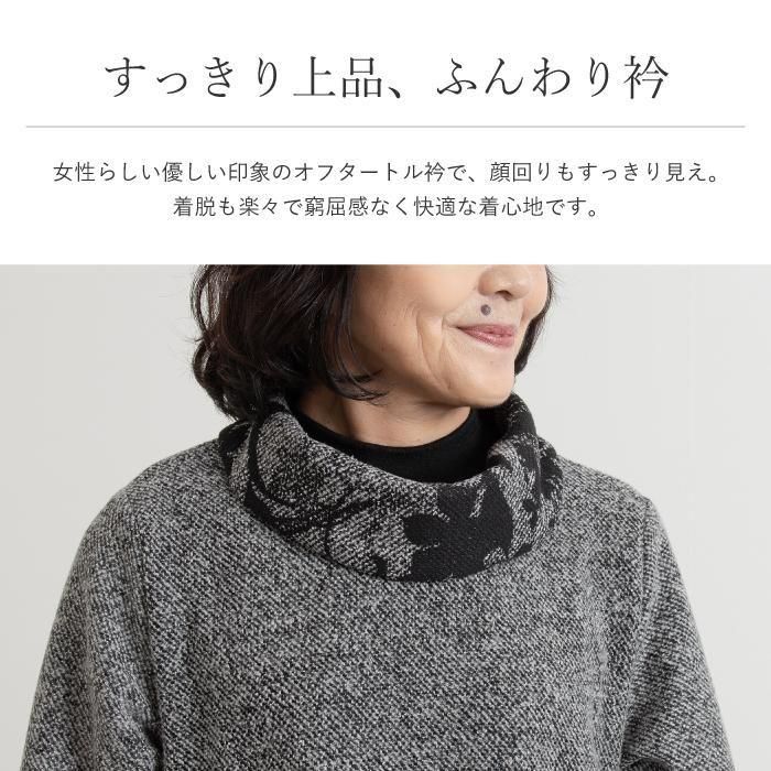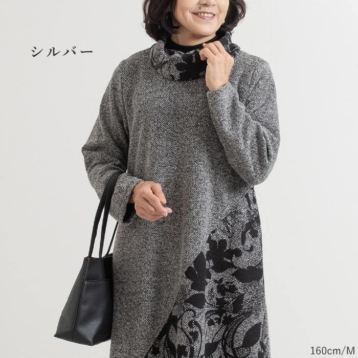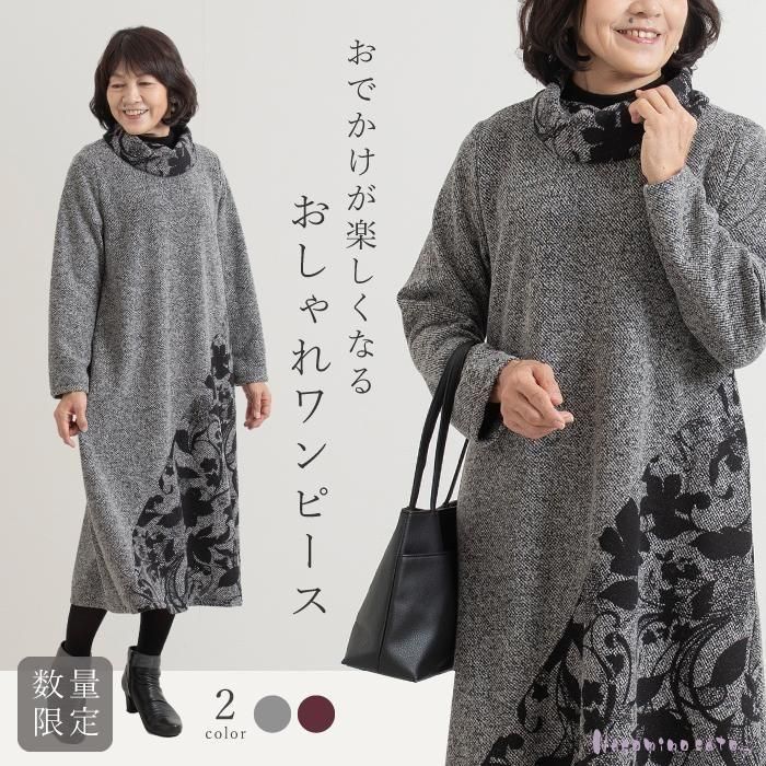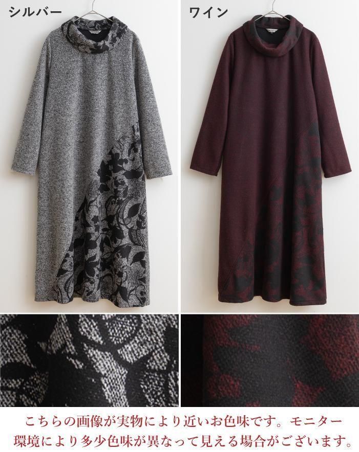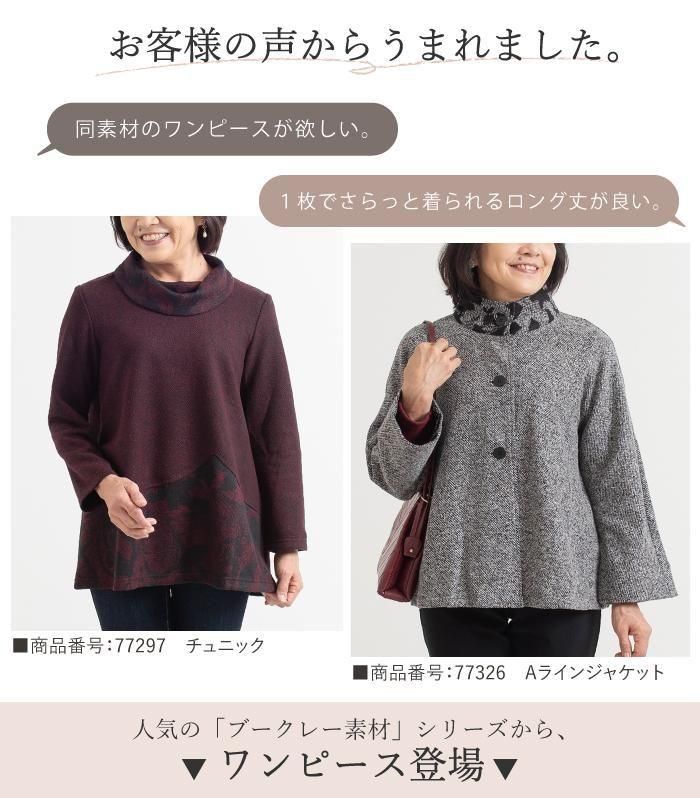 人気の「ブークレー調ニット素材」から、待望のワンピースが新登場。 お客様から寄せられた声をもとに、細部までこだわり抜いた一着です。 ふんわりと広がるフレアシルエットに、部分的な花柄の切り替えデザインがアクセント。無地ワンピースにはない華やかさを演出します。 オフタートルの衿元は、顔まわりをすっきり見せてくれるだけでなく、着脱もスムーズ。 たっぷりと生地を使った贅沢なロング丈は、お出かけをより楽しく、おしゃれにしてくれます。