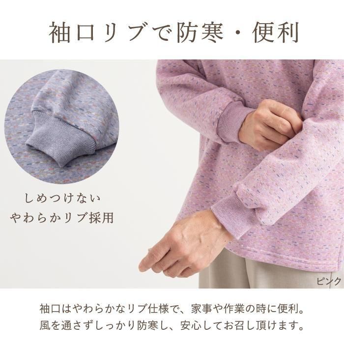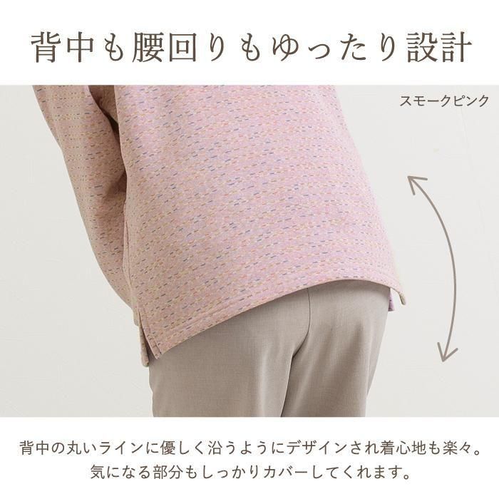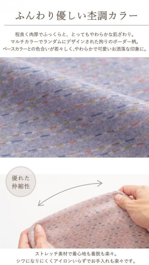 肌触りもやさしくあたたか。ゆったりとした着心地でおうち着や施設などの部屋着として、着回しやすく毎日着たくなる着心地です。