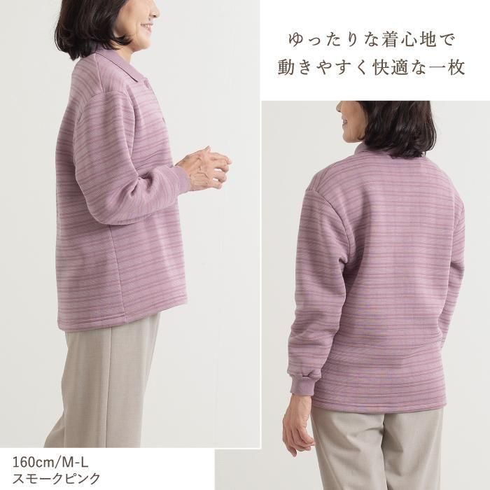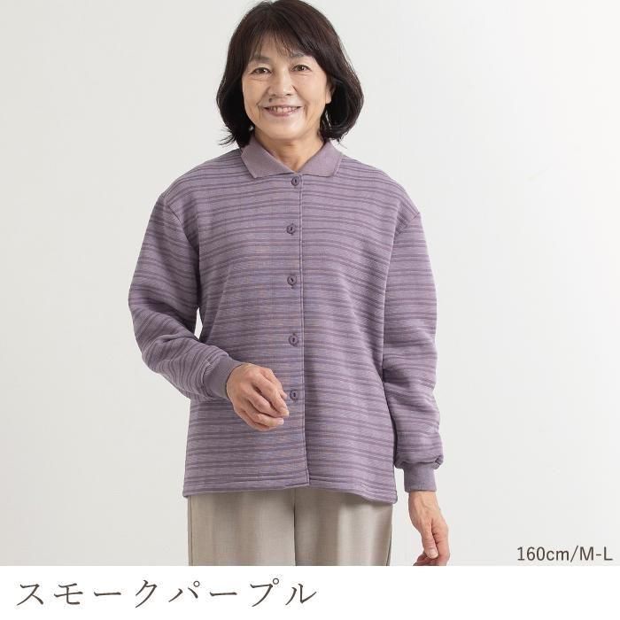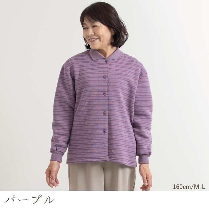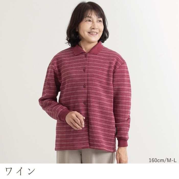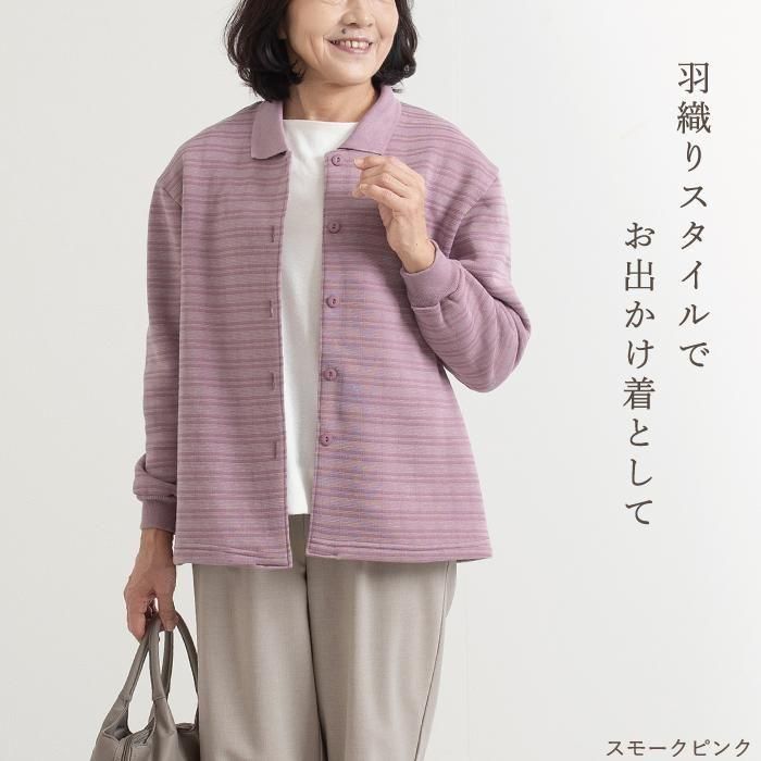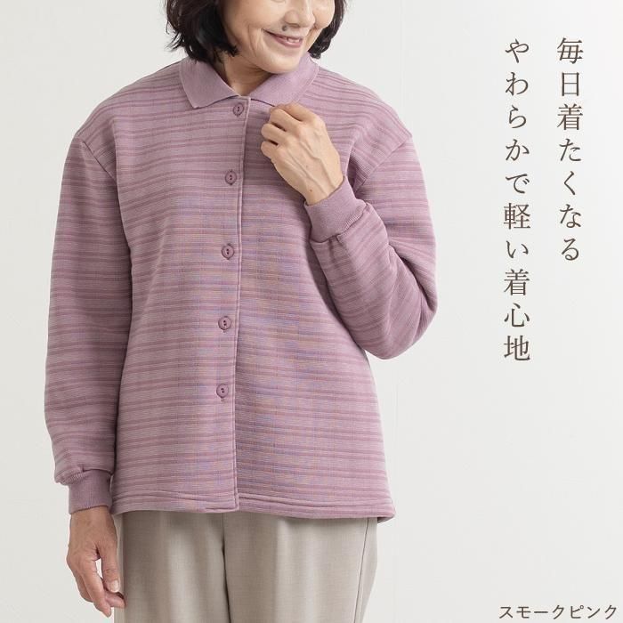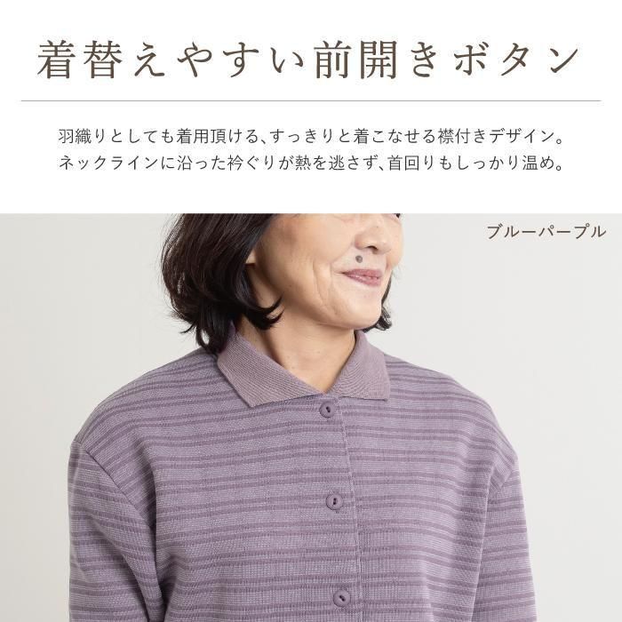 程よく肉厚な生地とふわふわ裏起毛が1つになったカーディガン。華やかさもありながら落ち着いた色合いのボーダー柄でしわになりにくくお手入れ楽々。