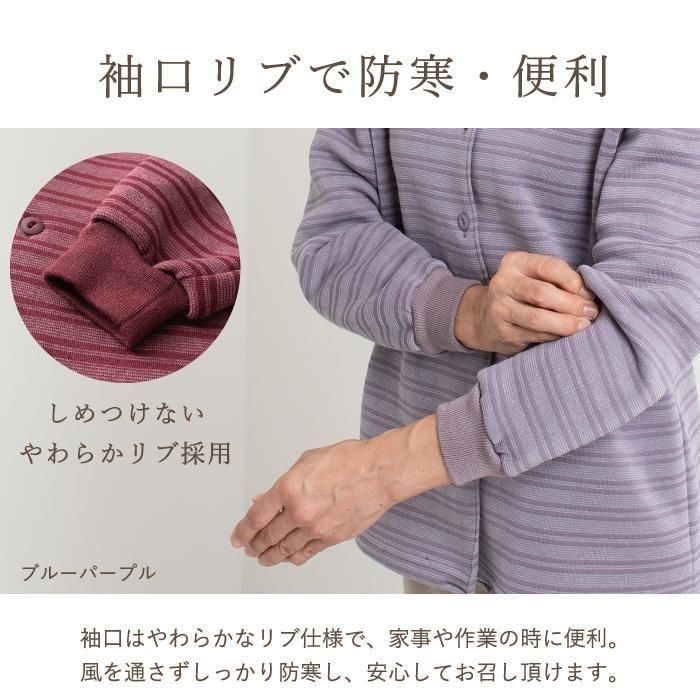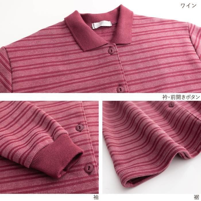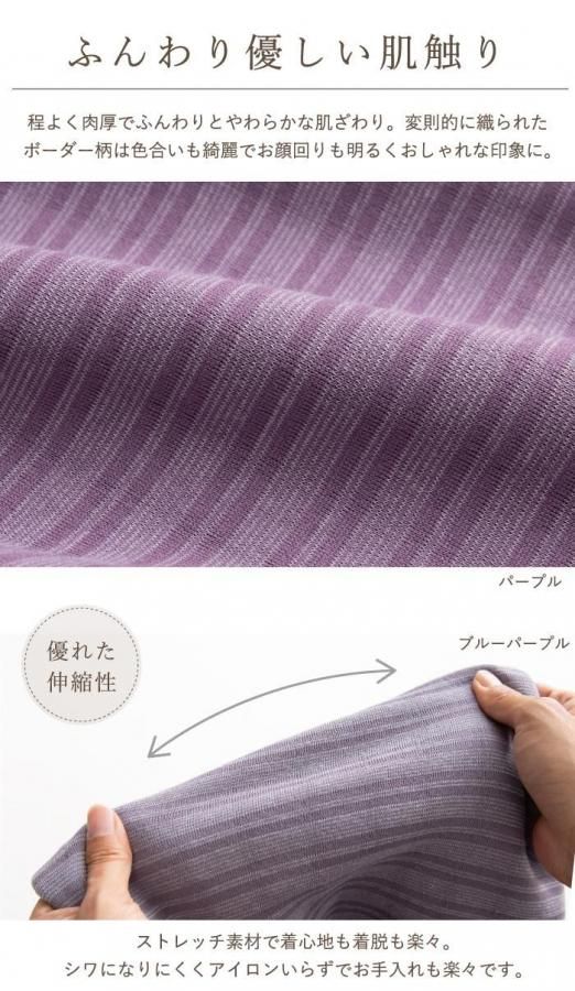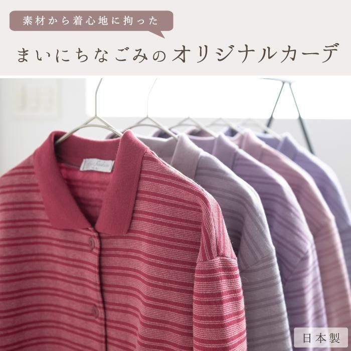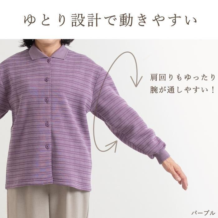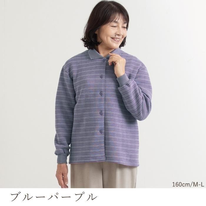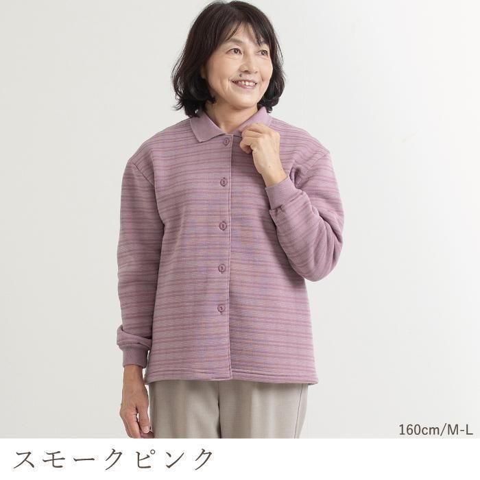 程よく肉厚な生地とふわふわ裏起毛が1つになったカーディガン。華やかさもありながら落ち着いた色合いのボーダー柄でしわになりにくくお手入れ楽々。