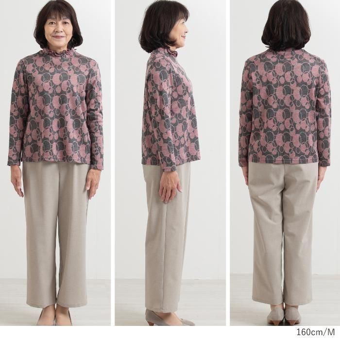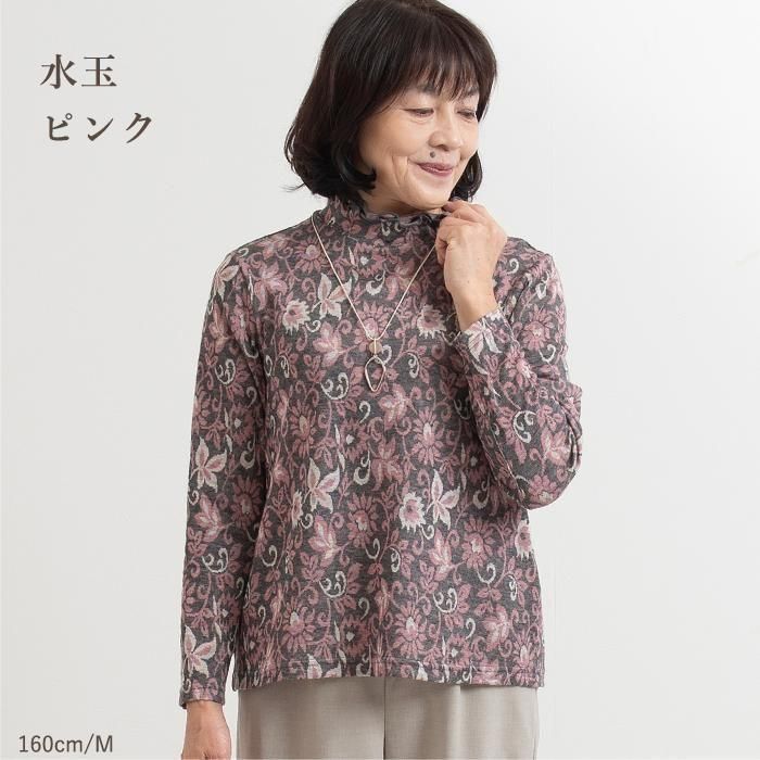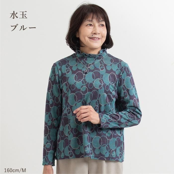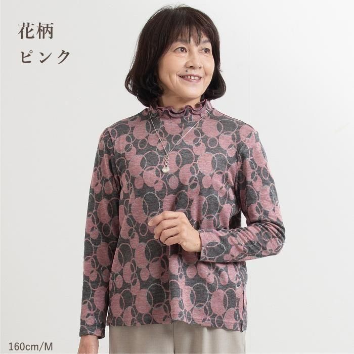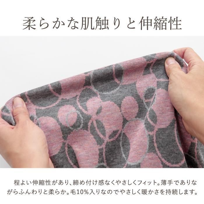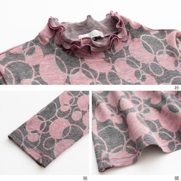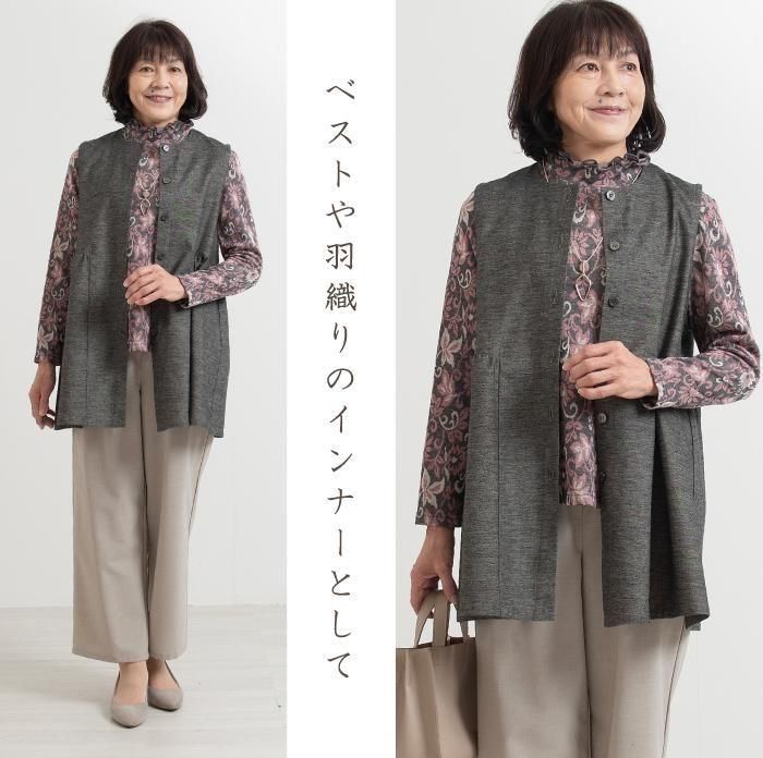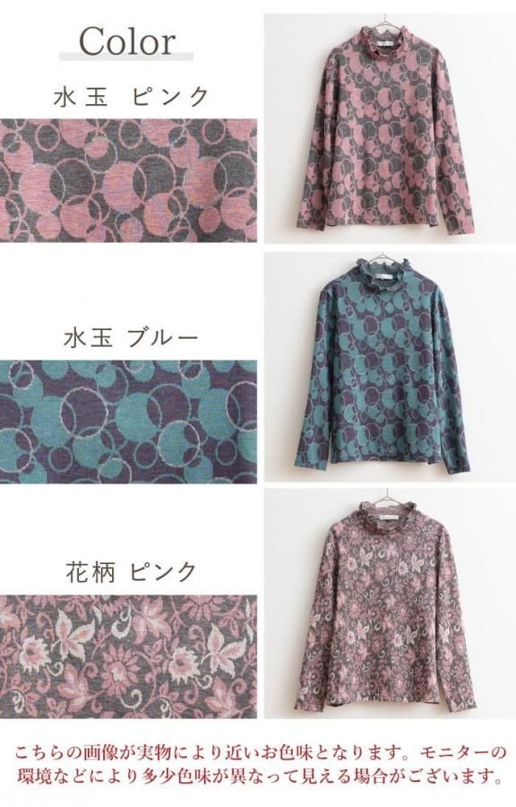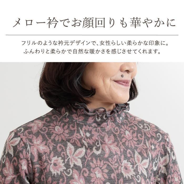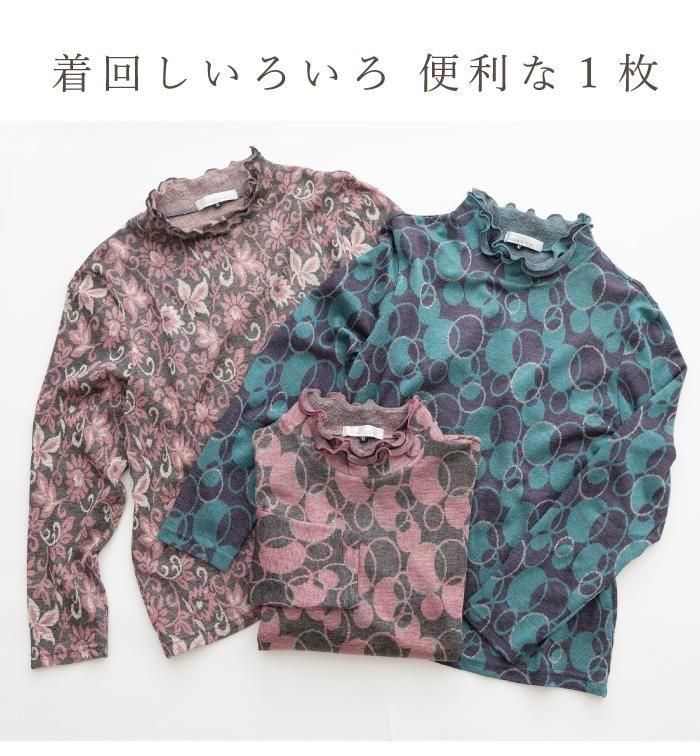 毛が10%入った冬におすすめの柄インナーは、やわらかな肌ざわりで適度な光沢感で上品なコーディネートに。 水玉模様と、花柄の2柄展開です。 衿はメロウ始末がされており、フリルで上品な大人可愛い印象に。程よく伸びるニット素材で動きやすく、1枚でも、インナーとして重ね着をお楽しみいただけます。